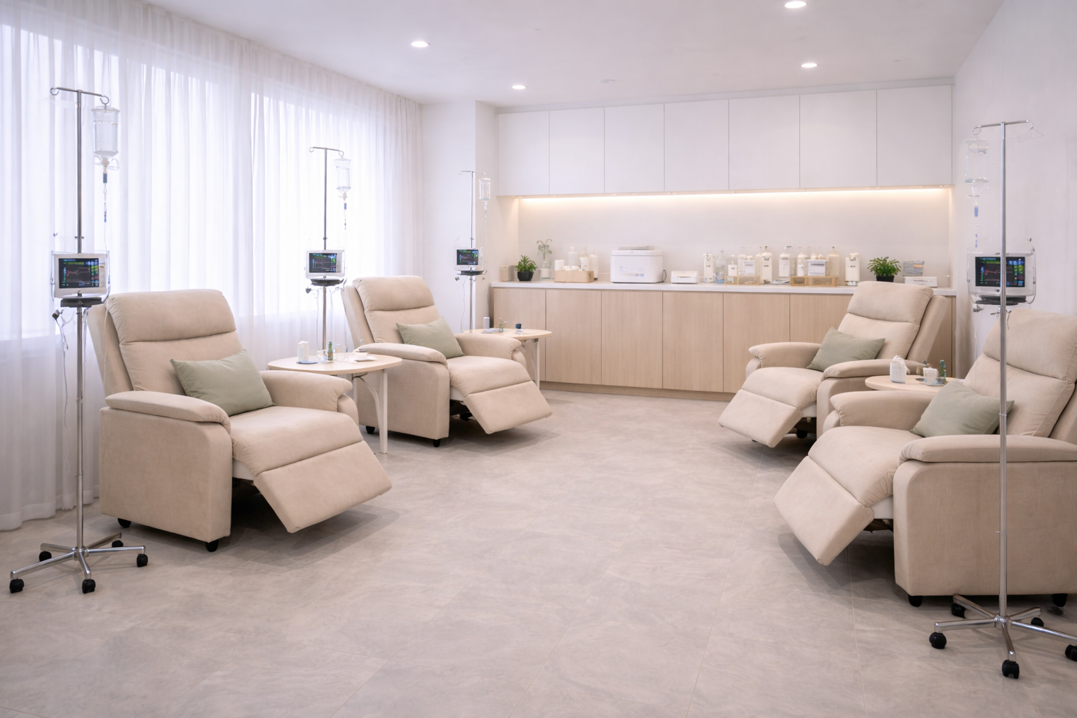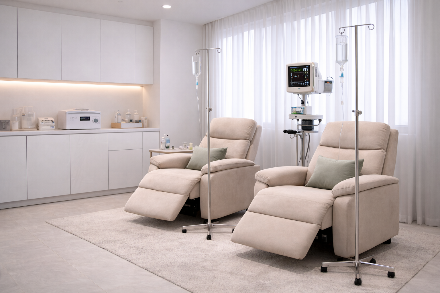 После этого врач готовит препарат и устанавливает систему. Лечение проходит в спокойной обстановке — пациент располагается в удобном кресле, может отдыхать, читать или слушать музыку.